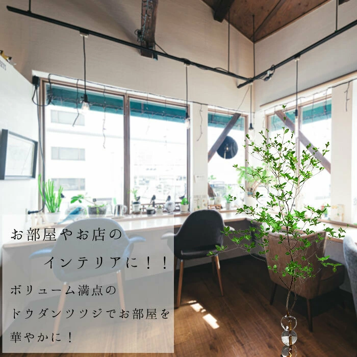 ドウダンツツジは天井近くまで広がるボリューム感がありながら、すらっとした細い枝とみずみずしい葉が特徴で、どんな空間に飾っても圧迫感を与えません。